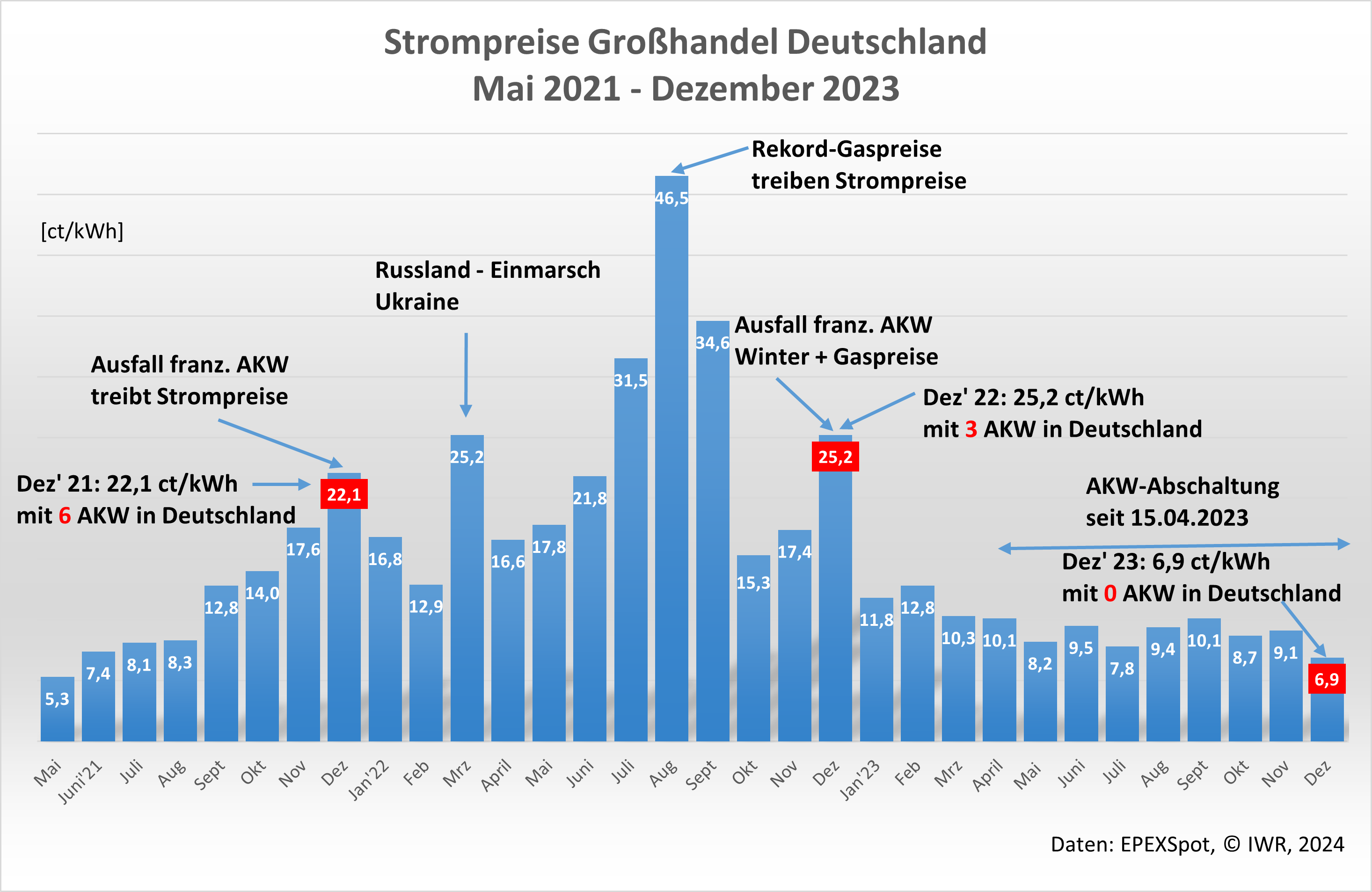 „Entgegen vieler Befürchtungen sind die Erzeuger-Strompreise an der Börse trotz des Atomausstiegs in Deutschland nicht gestiegen, sondern im Laufe des Jahres 2023 deutlich gefallen“, so IWR-Chef Dr. Norbert Allnoch in Münster.
